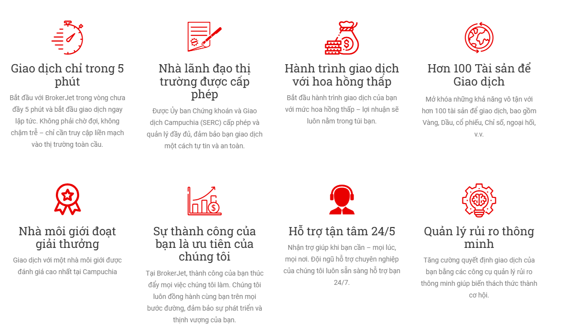 - Hỗ trợ tiếng Việt đầy đủ: Broker Jet cung cấp website và dịch vụ chăm sóc khách hàng riêng cho thị trường Việt Nam.