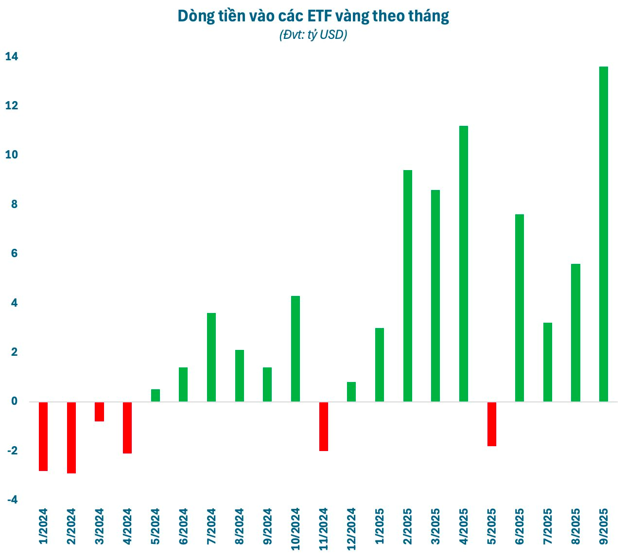 Theo thống kê, các quỹ ETF vàng trên toàn cầu đã hút tiền mạnh 4 tháng liên tiếp. Chỉ riêng trong tháng 9, các quỹ này đã rót khoảng 14 tỷ USD để mua vàng. Luỹ kế từ đầu năm, các quỹ vàng đã hút ròng tổng cộng 60 tỷ USD qua đó gom thêm tổng cộng gần 590 tấn vàng qua đó nâng tổng lượng nắm giữ vượt 3.800 tấn. Dòng vốn chủ yếu được dẫn dắt bởi các quỹ ETF vàng thuộc nhóm Black Rock, State Street Global Advisors (SSGA).