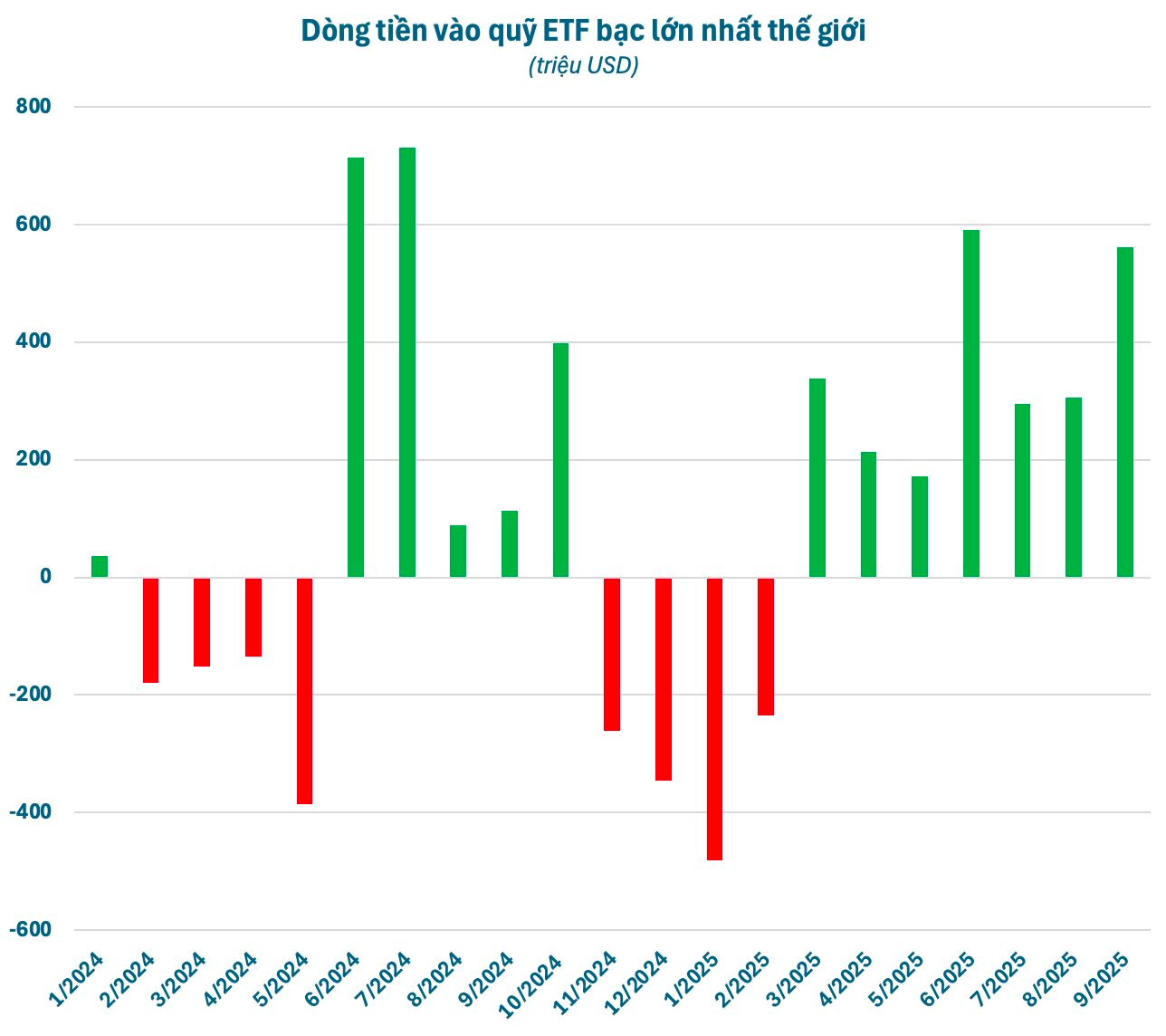 Trong khi đó, các quỹ bạc có quy mô khiêm tốn hơn nhiều nhưng cũng hút tiền rất mạnh thời gian qua. Quỹ bạc lớn nhất thế giới iShares Silver Trust đã hút ròng 7 tháng liên tiếp để mua vàng, đánh dấu chuỗi dài nhất trong nhiều năm. Luỹ kế từ đầu năm, quỹ đã hút về gần 1,7 tỷ USD để gom thêm khoảng 1.100 tấn bạc, qua đó nâng tổng lượng nắm giữ lên hơn 15.600 tấn.