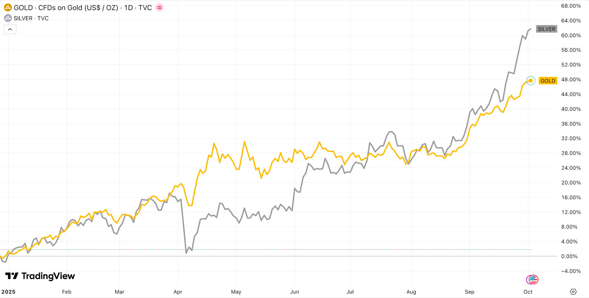 Cơn sốt kim loại quý chưa có dấu hiệu hạ nhiệt trên toàn cầu. Giá vàng đã tăng gần 50% từ đầu năm, lập đỉnh mới gần 3.900 USD/ounce trong khi giá bạc tăng đến hơn 60% qua đó tiến gần đến đỉnh lịch sử. Xu hướng được dự báo khó có thể đảo ngược trong ngắn hạn khi dòng tiền lớn vẫn ồ ạt đổ vào mua gom.