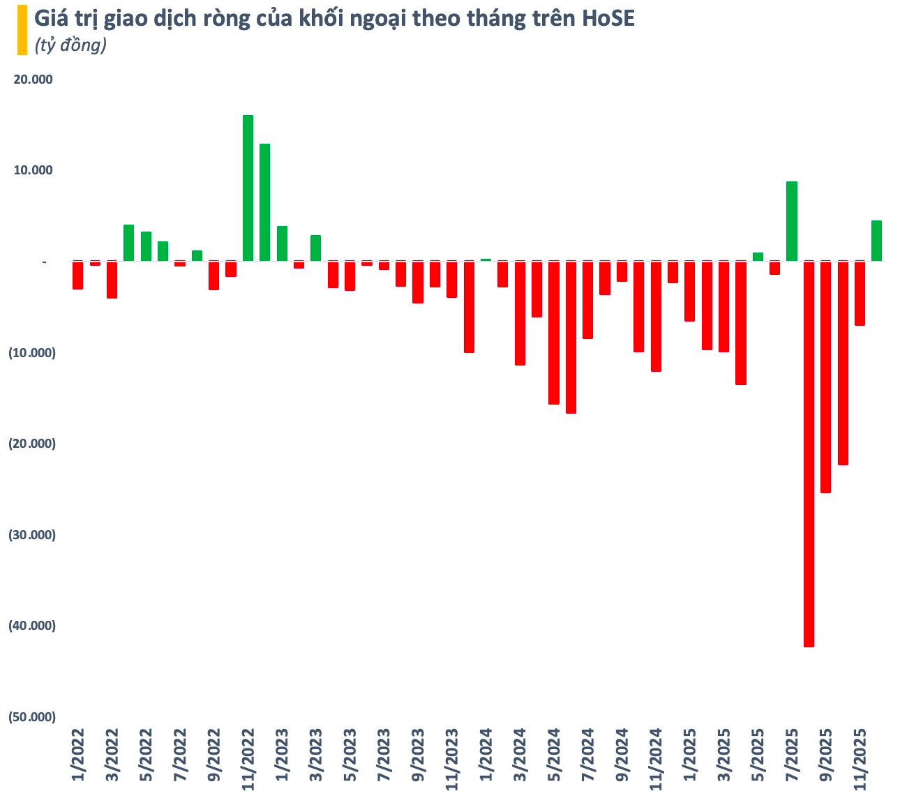 Một tín hiệu tích cực khác đến từ khối ngoại – vốn được xem là “tay chơi lớn” trên thị trường. Trong tháng 11, nhà đầu tư nước ngoài bán ròng hơn 6.900 tỷ đồng trên sàn HoSE – mức thấp nhất trong 4 tháng. Trước đó, trong giai đoạn tháng 8–9–10, tổng giá trị bán ròng của khối này lên tới gần 90.000 tỷ đồng. Đáng chú ý, bước sang tháng 12, dòng vốn ngoại đã có dấu hiệu đảo chiều, khi mua ròng trở lại khoảng 4.400 tỷ đồng, cho thấy niềm tin dần quay lại với thị trường Việt Nam.