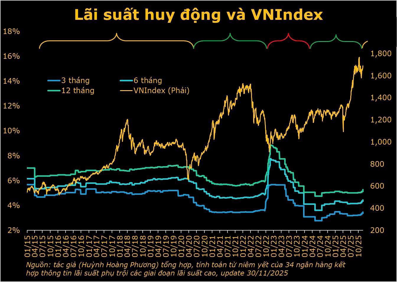 Nếu nhìn lại chu kỳ kinh tế và diễn biến của VN-Index, có thể thấy thị trường chứng khoán luôn vận hành khá nhất quán với xu hướng biến động của lãi suất. Mỗi pha thay đổi của lãi suất đều tạo ra “tông màu” khác nhau cho tâm lý nhà đầu tư và hành vi dòng tiền.