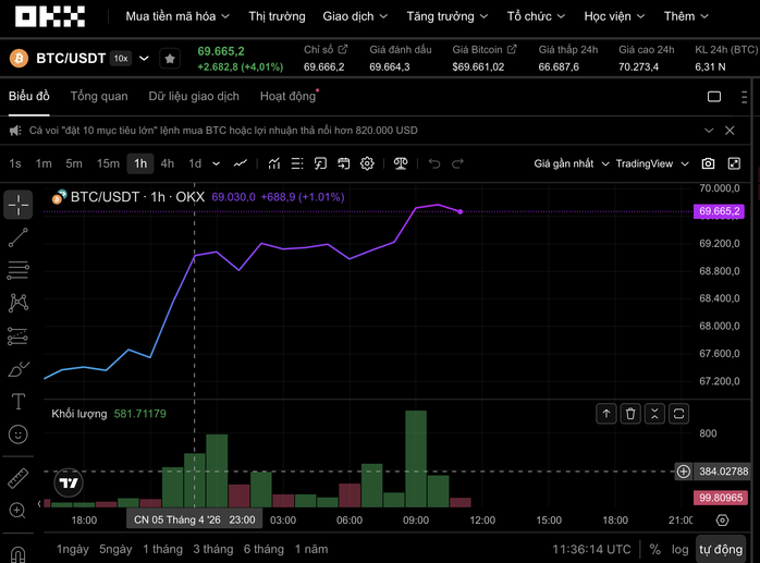 Tối ngày 6/4, thị trường tiền mã hóa bất ngờ ghi nhận nhịp tăng khá ấn tượng. Theo dữ liệu từ sàn OKX, trong vòng 24 giờ, Bitcoin tăng hơn 4%, vượt mốc 69.600 USD. Không chỉ riêng Bitcoin, nhiều đồng coin vốn hóa lớn cũng đồng loạt bứt phá: Ethereum tăng trên 5% lên quanh 2.150 USD, trong khi XRP và BNB cùng ghi nhận mức tăng hơn 3%.