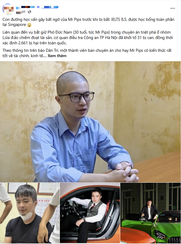 Mạng xã hội đang xôn xao về vụ bắt giữ TikToker Mr. Pips (tên thật Phó Đức Nam), một trong những vụ án lừa đảo đầu tư tài chính lớn nhất từ trước đến nay tại Việt Nam. Theo cơ quan chức năng, vụ án đã khởi tố 31 bị can với các tội danh như “Lừa đảo chiếm đoạt tài sản”, “Rửa tiền”, “Không tố giác tội phạm” và “Chứa chấp tài sản do người khác phạm tội mà có”.