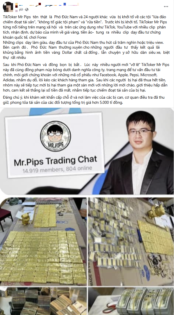 Phó Đức Nam, người nổi tiếng với nickname TikToker Mr. Pips, đã thu hút hàng trăm nghìn người theo dõi nhờ các video khoe cuộc sống xa hoa và chia sẻ “bí quyết” kiếm tiền. Trên TikTok và YouTube, anh ta thường xuất hiện bên cạnh những đống tiền vàng, siêu xe, biệt thự, tạo dựng một hình ảnh “thành công” trong đầu tư tài chính.